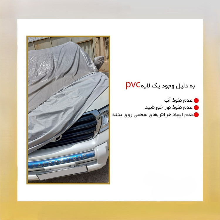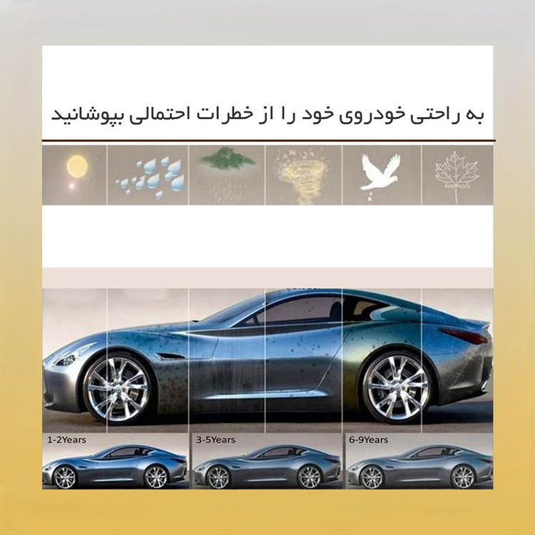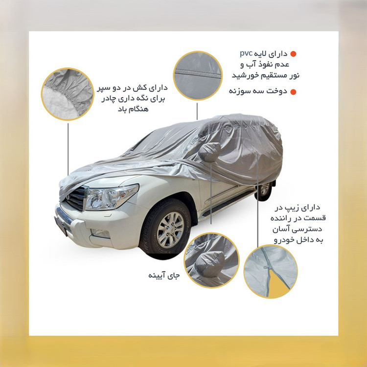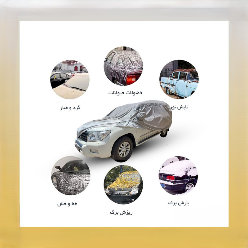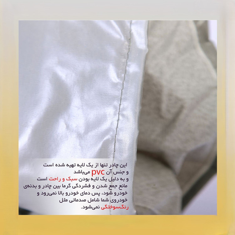 سایر توضیحات: دارای زیپ درب راننده - جای آینه -بازتاب دهنده نور خورشید - جلوگیری از داغ شدن بیش از اندازه داخل خودرو - غیرقابل نفوذ در برابر آب -محافظت خودرو از اشعه های مضر uv خورشید -جلوگیری از ایجاد آثار مخرب روی رنگ و بدنه خودرو