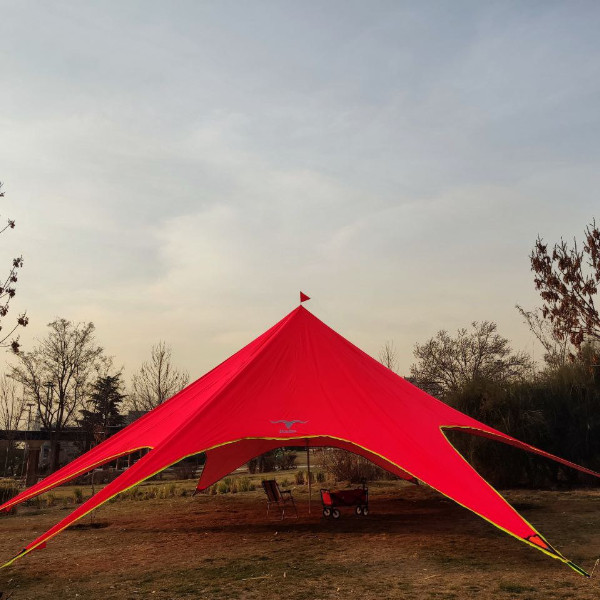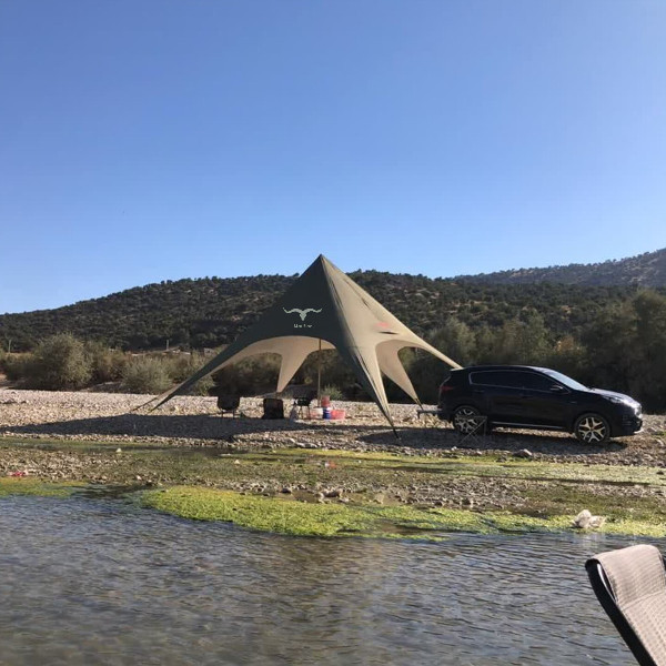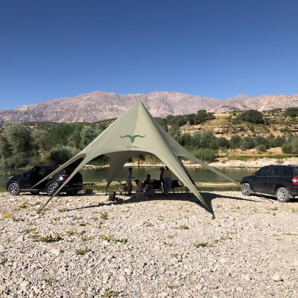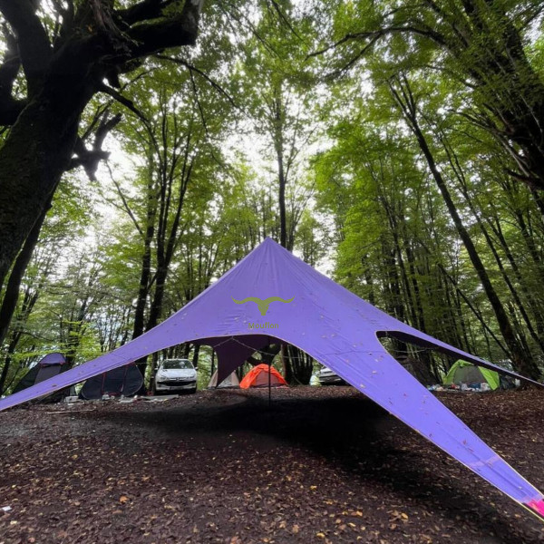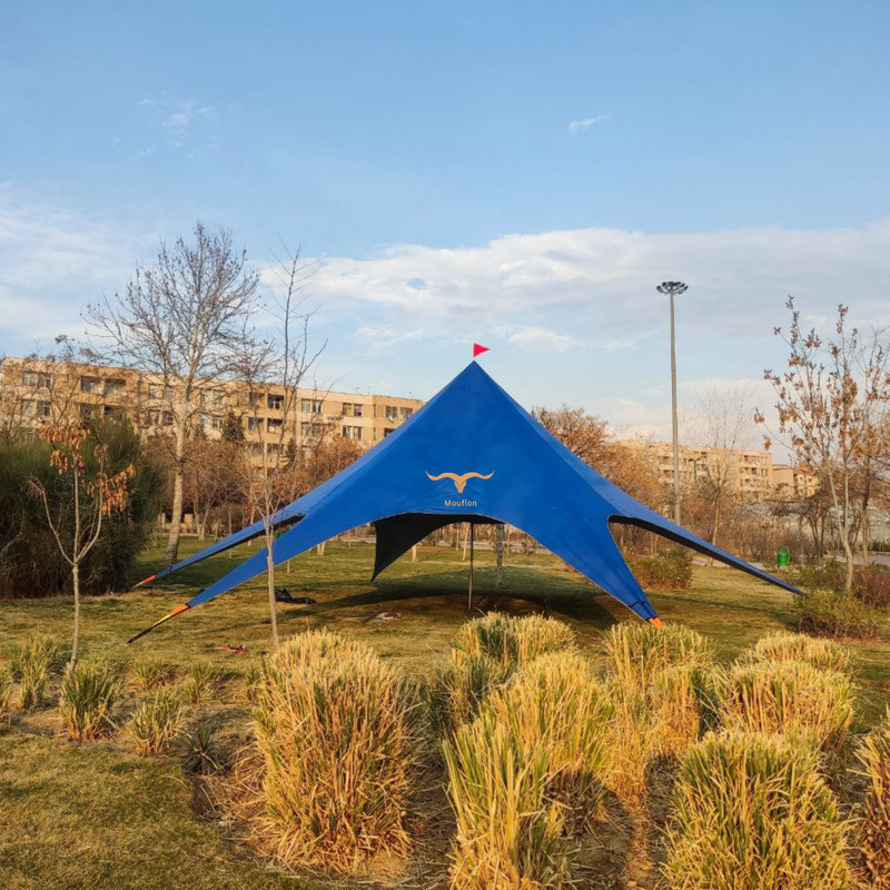 سایبان ستارهای موفلان مدل استار تنت سایبانی بسیار جذاب و زیبا برای کمپها دورهمی،ها گروه های ورزشی همچنین همایش و مراسمات و جشنهای شما میباشد که علاوه بر طراحی زیبا و چشمگیر از رنگهای بسیار جذابی برخوردار است.. اغلب در سفرها اطراف سواحل و کویرها با مشکل نبود سایه مواجه هستیم حتی شاید ساعتها دنبال جای مناسب دارای سایه بگردیم یا مجبور به ترک کردن محل کمپمون بشیم بخاطر بارش ناگهانی باران سایبان ستاره ای رو میتونید کمتر از ده دقیقه بنا کرده از سایه آن لذت برده و از طراحی جذاب ان متعجب شوید و در کنار عزیزانتان بهترین لحظات را ثبت نمایید. جنس پارچه از پلی استر سه لایه بسیار مقاوم است همچنین دوخت ان در مقابل کششهای ناشی از جریان باد و بارش باران مقاومت بالایی دارد. طراحی این سایبان به نحوی بوده تا بتواند بیشترین مساحت سایه را ایجاد کند همچنین ارتفاع قسمتهای هلالی ان بلند درنظر گرفته شده تا علاوه بر گردش آزاد ،هوا رفت و امد افراد زیر آن به راحتی میسر باشد، همچنین بتوان زیر آن چندین میز و صندلی برای حتی گروه های پر جمعیت قرار داد یا چندین چادر در زیر آن بنا کرد همچنین قابلیت ورود خودرو به زیر سایبان هم وجود دارد تا در مقابل بارشهای ناگهانی و تابش مستقیم نور آفتاب در امان باشید. در طراحی این محصول قسمتهایی بصورت جیب برای نگه داری از لوازم کوچک مانند گوشی موباید یا پاور بانک در نظر گرفته شده، ودر قسمت هلالی تسمه هایی برای نصب ریسه دوخته شده که میتوان با نصب لامپ ریسهای محیطی رویایی را در تاریکی شب ایجاد کرد. ضمنا این محصول دارای کیت حرفه ای برای نصب میباشد که شامل: 6 عدد میخ ساده ابکاری شده مخصوص زمینهای سخت و جنگلی میباشد 6 عدد میخ نبشی ابکاری شده مخصوص زمینهای نرم و شنی میباشد دستکش جهت کار با قسمتهای فلزی میباشد چکش مخصوص میباشد
