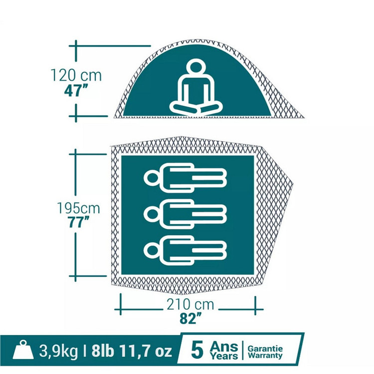 سایر توضیحات : - مناسب برای 3 عدد کیسه خواب با عرض 65 سانتیمتر، مقاوم در برابر آب و باد تا سرعت 40 کیلومتر، کفی چادر مقاوم تا 2000 میلیمتر نفوذ آب، دارای 3 جیب برای قرار دادن وسایل